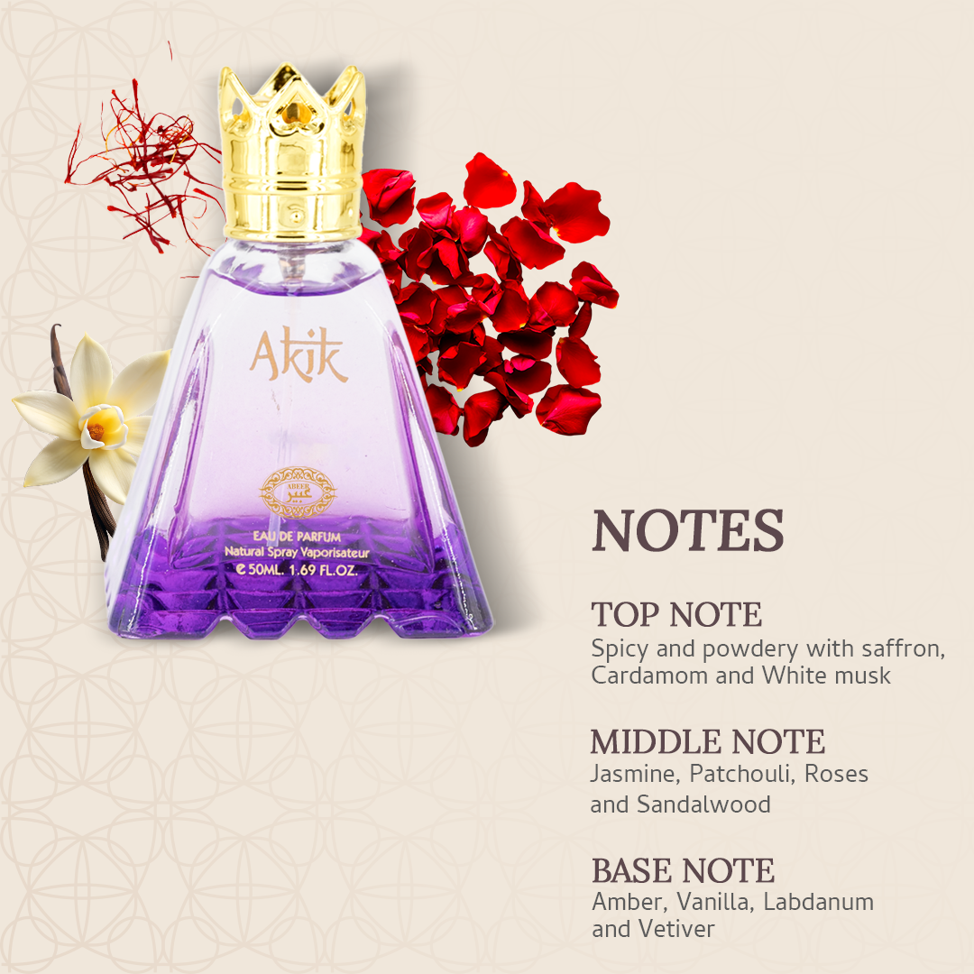 Akik is a rich perfume that exudes elegance and depth. It opens with a bold saffron, cardamom, and white musk blend, which gives it a spicy yet powdery allure. As the scent unfolds, a rich heart of jasmine, patchouli, roses, and sandalwood adds warmth and sophistication. The base lingers with the sensual embrace of amber, vanilla, labdanum, and vetiver, leaving a lasting impression of opulence and mystery. Perfect for anyone who loves and adores beautiful refined full fragrance. Akik emits timelessness of style and poise to make you smell elegant than ever.