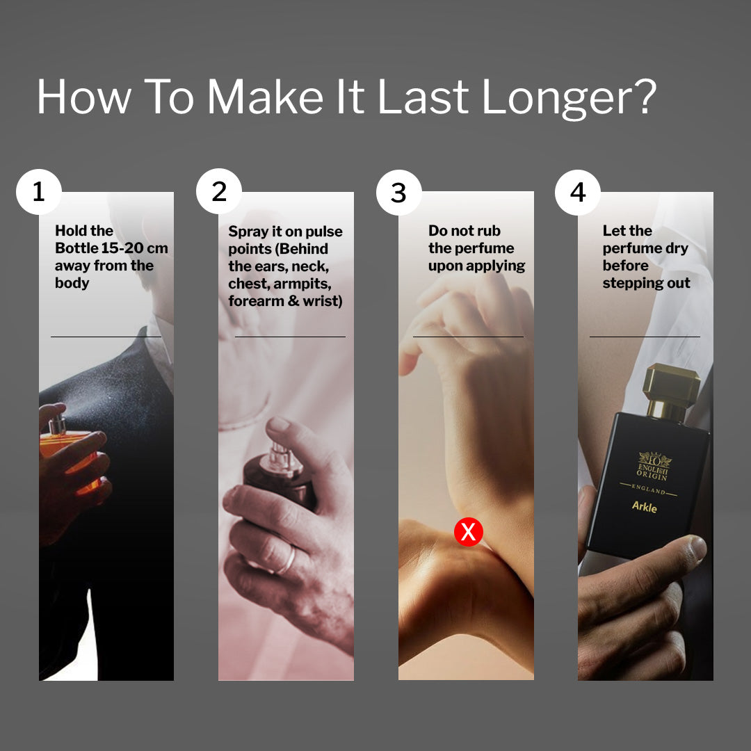 For best results, hold the perfume 3-6 inches away from skin. Lightly spray fragrance on pulse points, including neck, chest, and wrists. Avoid spraying it very close to the clothes, as it may leave oil stains because of its high oil content.
