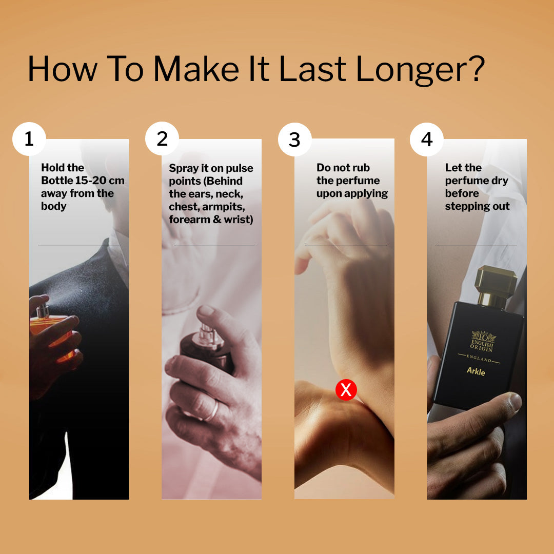For best results, hold the perfume 3-6 inches away from skin. Lightly spray fragrance on pulse points, including neck, chest, and wrists. Avoid spraying it very close to the clothes, as it may leave oil stains because of its high oil content.
