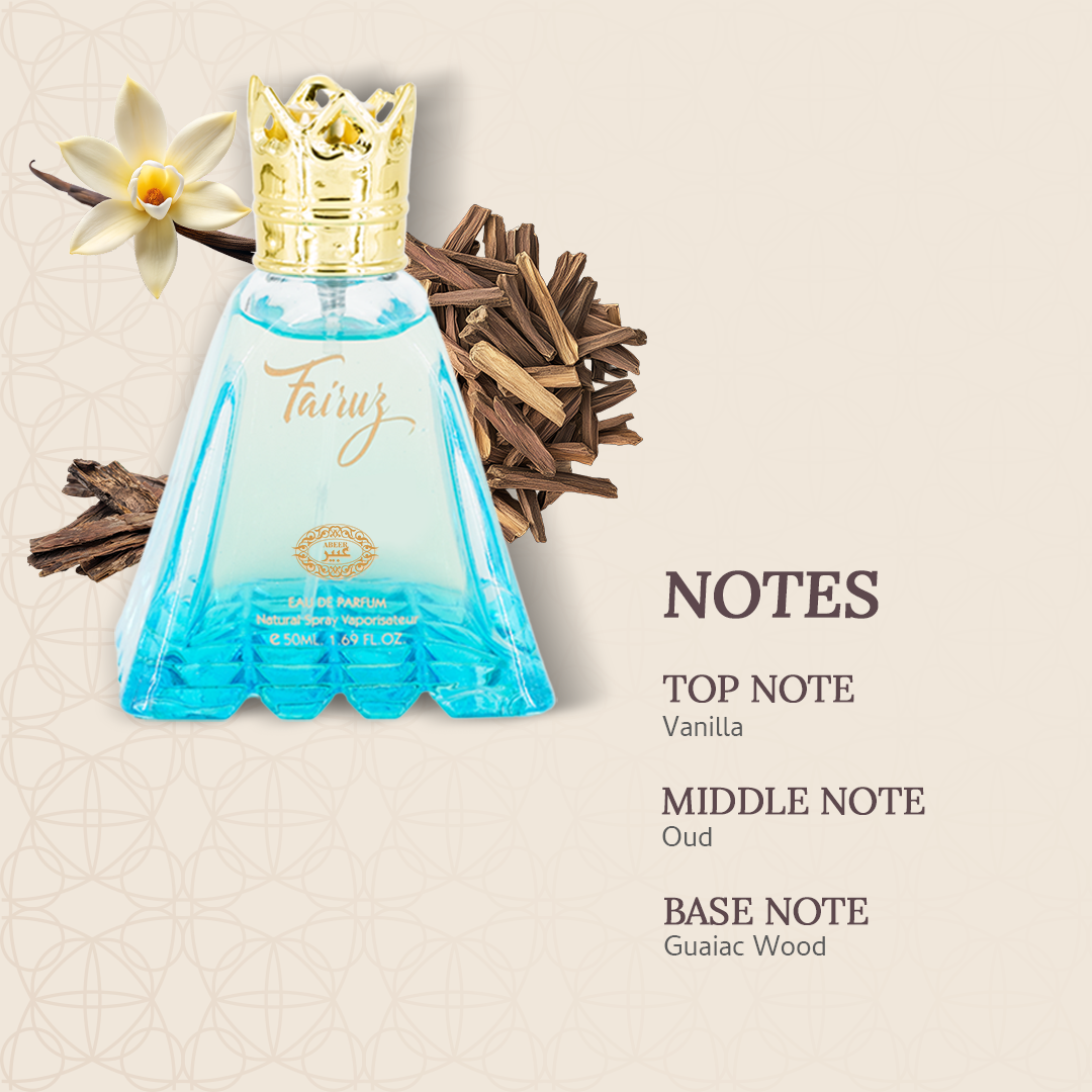 Fairuz is a fragrance that exudes warmth and sophistication. It catches your attention with its rich creamy embrace of vanilla and leaves you spellbound only to be mesmerized by the deep and resinous essence of oud. That's not even the end, the base note of guaiac wood anchors the composition with its smoky, slightly sweet undertones. It is an elegant scent for the graceful personalities and deserves a home in your heart and your capsule wardrobe. Wherever you go, you will keep this perfume near you, for it's the epitome of elegance and class. If you love to maintain a refined demeanor with every look, then fairuz is the best choice for you.