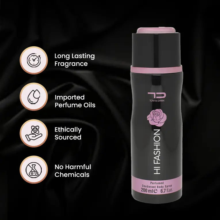Own your high-fashion edge with Deo Hi Fashion, the captivating men's deodorant from Tom & Darin. Blend of exquisite notes including Wild Strawberry, Rose, and Musk, Hi Fashion is more than just a fragrance—it's your signature accessory, guaranteed to turn heads and leave a lasting impression wherever you go.