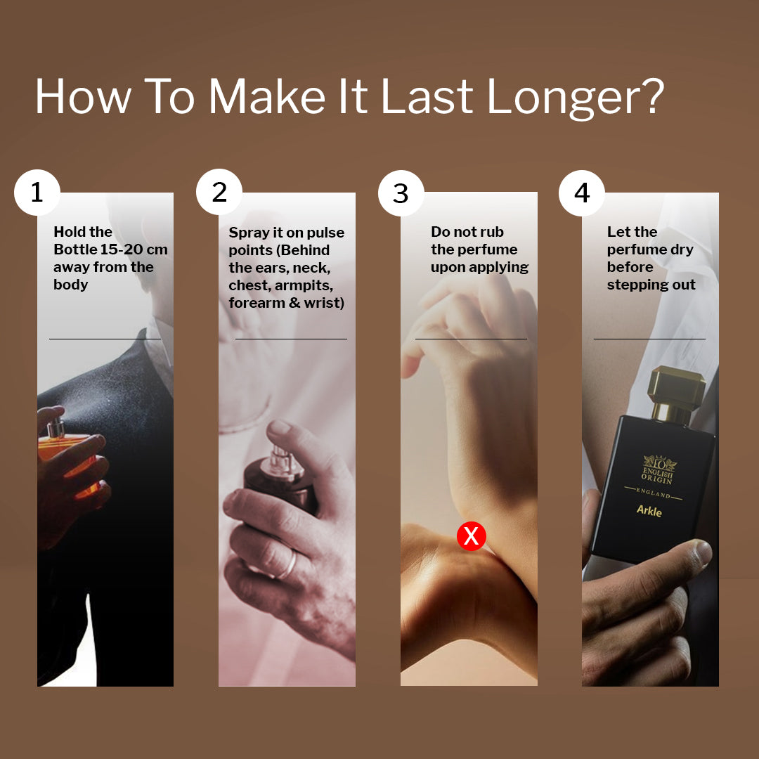 For best results, hold the perfume 3-6 inches away from skin. Lightly spray fragrance on pulse points, including neck, chest, and wrists. Avoid spraying it very close to the clothes, as it may leave oil stains because of its high oil content.