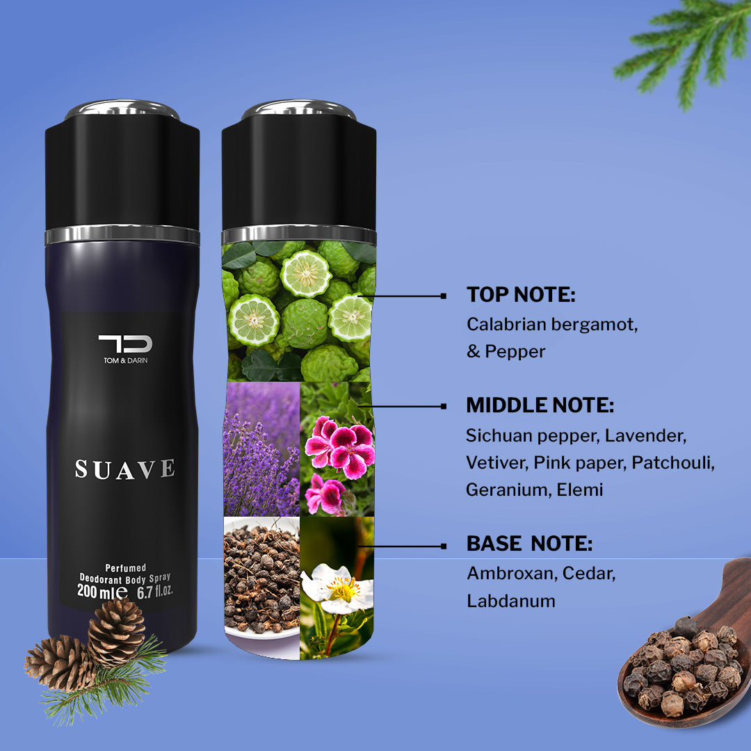 The sophisticated men's deodorant from Tom & Darin. This sophisticated deodorant blends classic scents with modern appeal, exuding confidence and refinement. Infused with Calabrian bergamot, Pepper, and other exquisite notes, it offers a long-lasting, addictive fragrance experience. Unveil your suave charm with every spray of Deo Suave, a symbol of timeless elegance for the modern man.