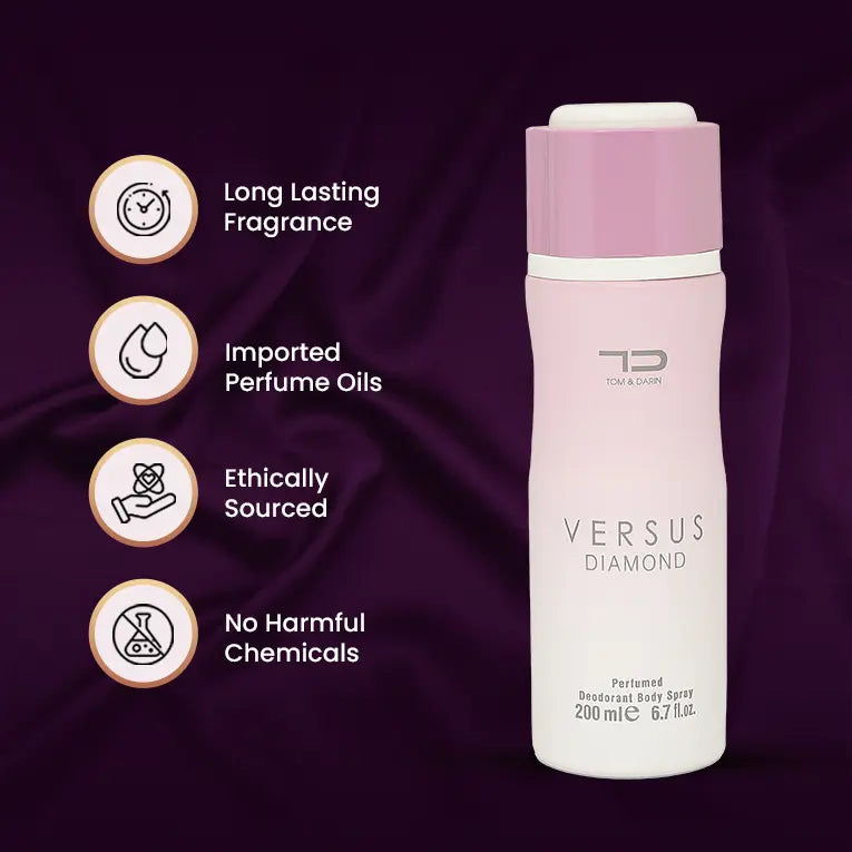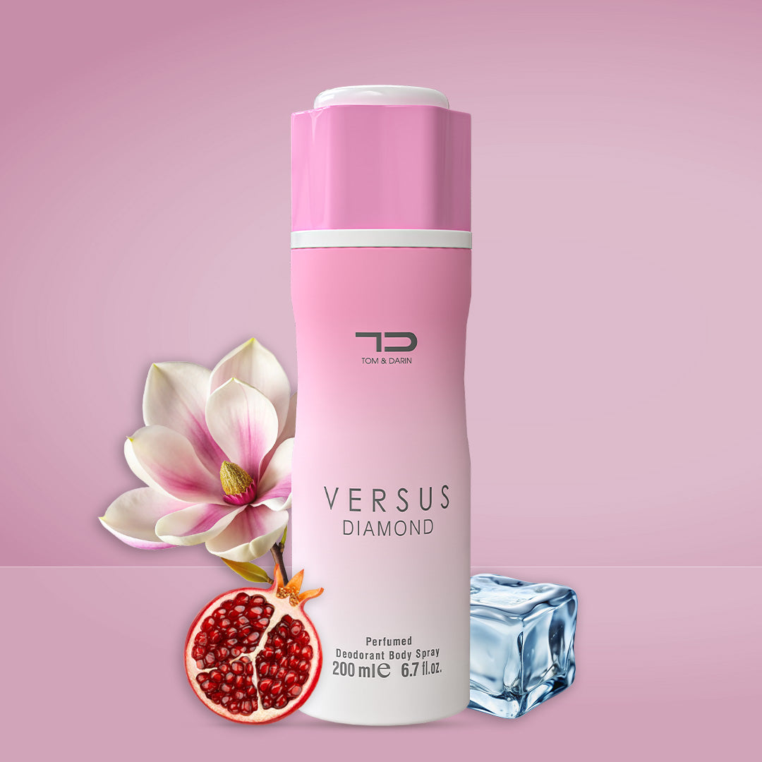 Embrace the radiance of confidence with Deo Versus Diamond. Top notes of Yuzu, Pomegranate, and Ice, followed by Peony, Lotus, and Magnolia at its heart, and anchored by Musk, Mahogany, and Amber at its base, it creates an aura of irresistible allure. Elevate your grooming routine with the brilliance of Versus Diamond