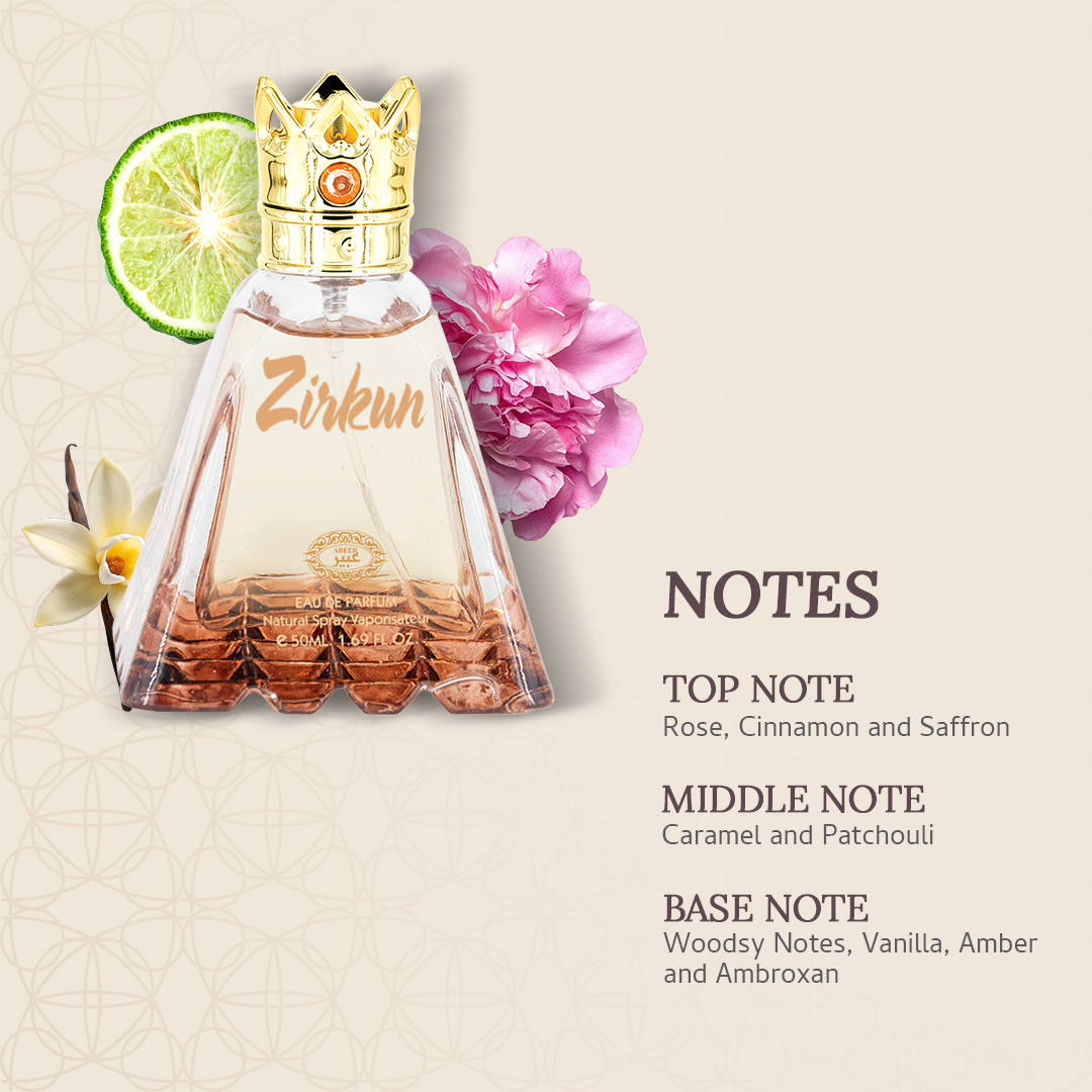 Zirkun Perfume for Women is a luxurious blend of deep rose and warm cinnamon, enriched with sweet caramel and earthy patchouli. Elegant and long-lasting, it leaves a captivating trail of sophistication. Perfect for any occasion, this exquisite fragrance makes an ideal gift for her, celebrating grace and charm with every enchanting spritz.
